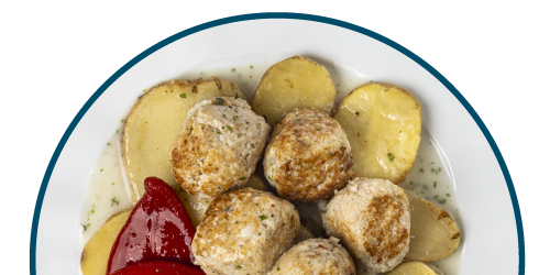 Albóndigas (40%): Burguer meat (recorte de carne de cerdo y de vacuno, agua, proteína y fibra vegetal de soja, proteína animal [cerdo], sal, almidón de patata, azúcares [dextrosa], dextrina, ajo y perejil, especias, aroma, conservador [metabisulfito potásico], antioxidante [ascorbato sódico]); Salsa a la crème (36%): agua, nata (leche) (crema, estabilizantes: carragenano, celulosa microcristalina, carboximetilcelulosa sódica), caldo de ternera (ternera, agua, salsa de maíz [almidón de maíz fermentado, sal], pasta de tomate, harina de arroz, zumo concentrado de zanahoria, zumo concentrado de cebolla, sal, zumo concentrado de puerro, pimienta negra, aceite de girasol, extracto de romero), aromas naturales, lecitina de soja, sal, cebada (gluten) malteada, espesantes (goma xantana, goma guar); Patata asada (24%): patata, sal; Champiñones.